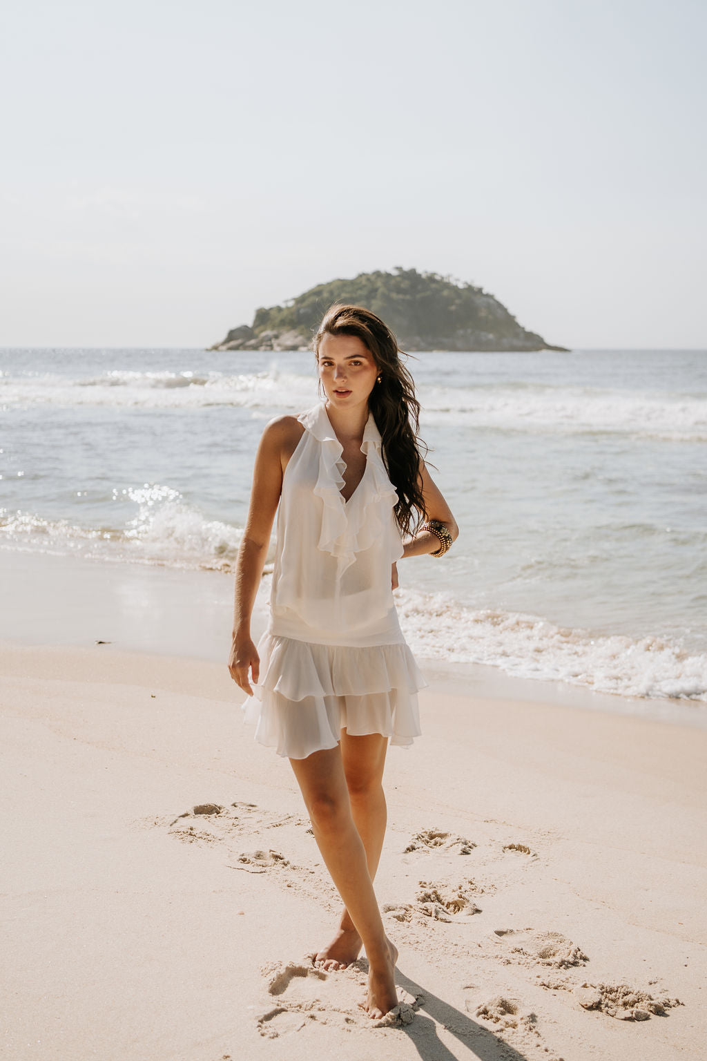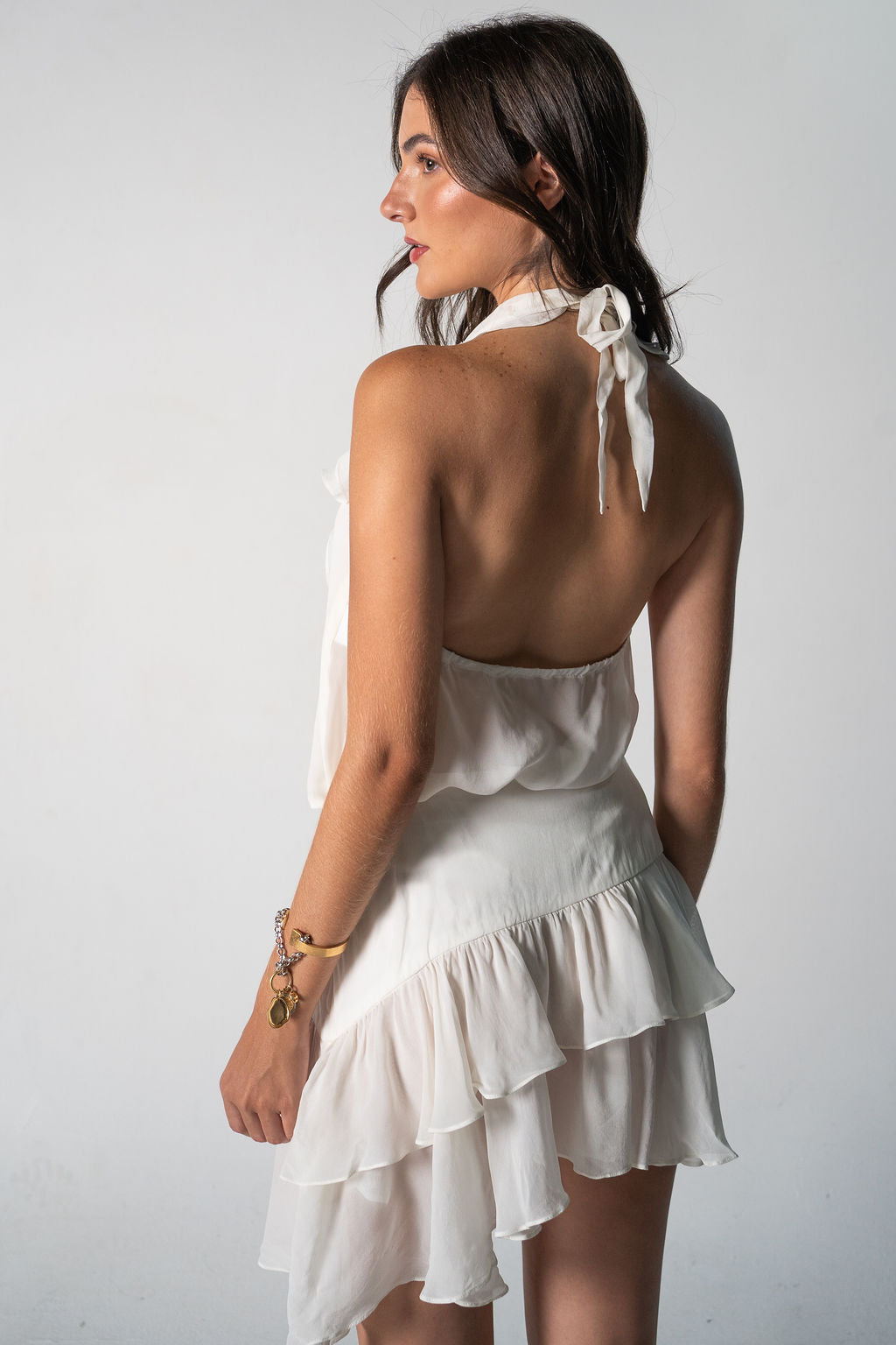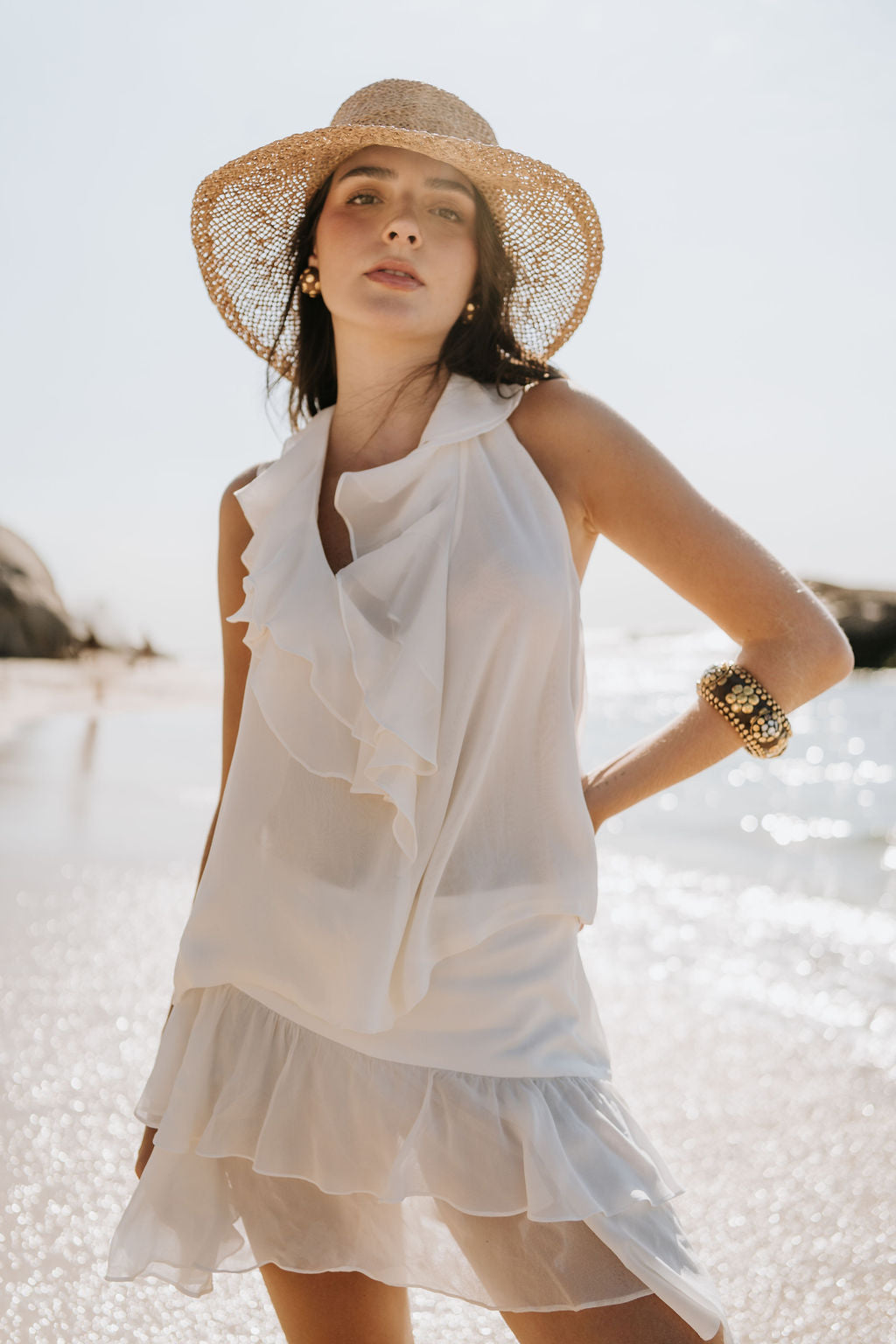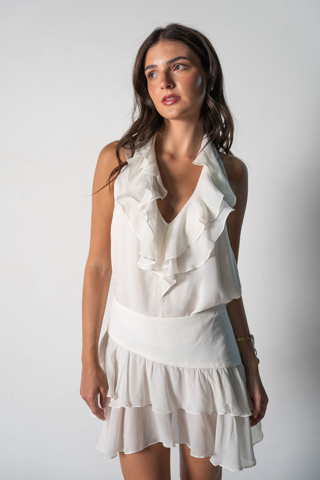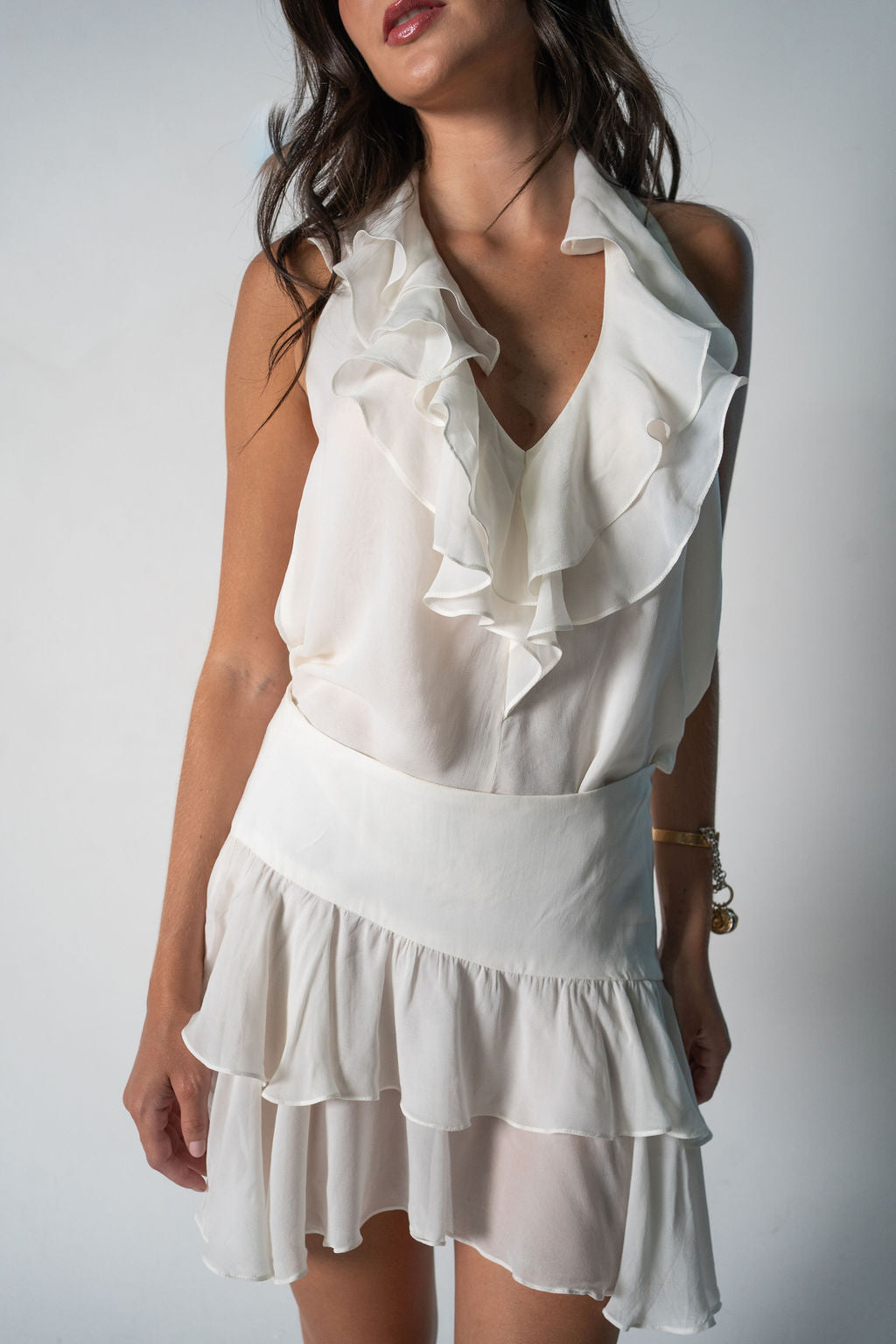 • Saia assimétrica com babados feita em GGT de viscose. Possui pala forrada e ziper lateral