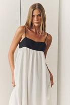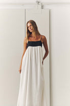 • Vestido de alcinha, amplo, bicolor, feito em cambraia de algodão e forrado. Possui regulagem nas alças