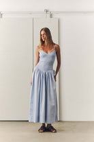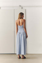 - Vestido azul listrado com parte de cima em lastex e saia ampla.