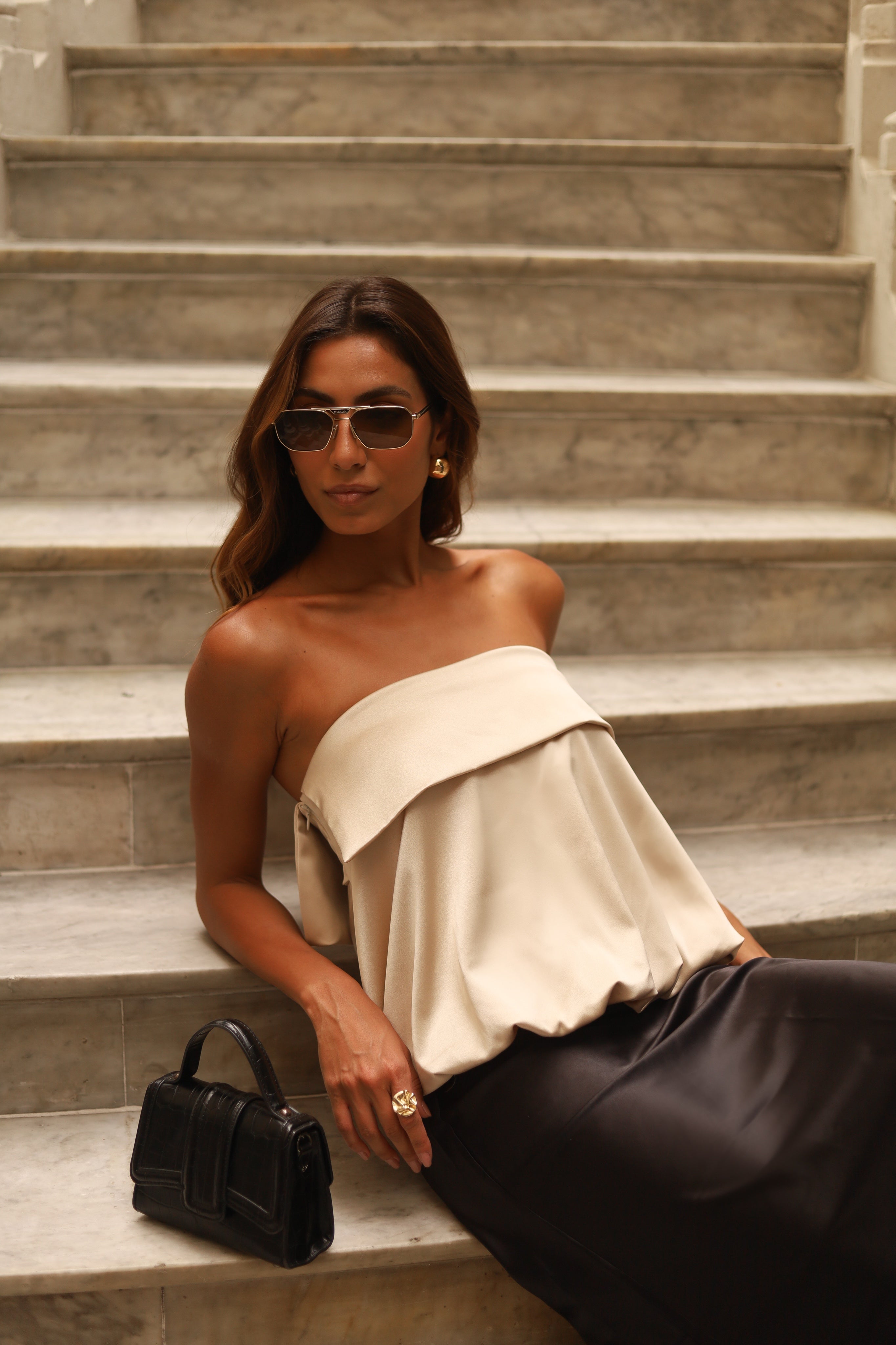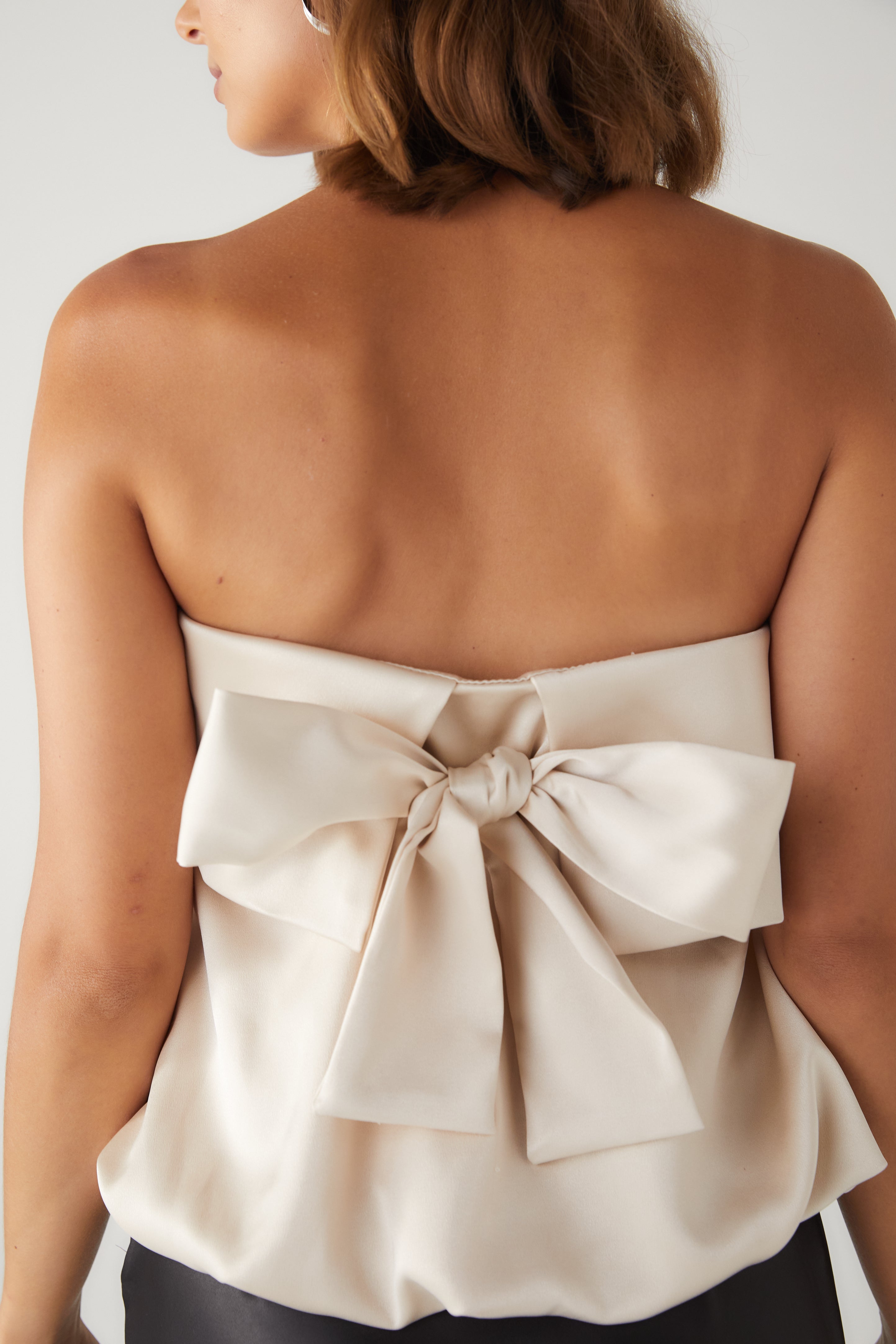 • Top em crepe de cetim com modelagem balonê, tomara que caia, amarração atrás e ziper lateral.