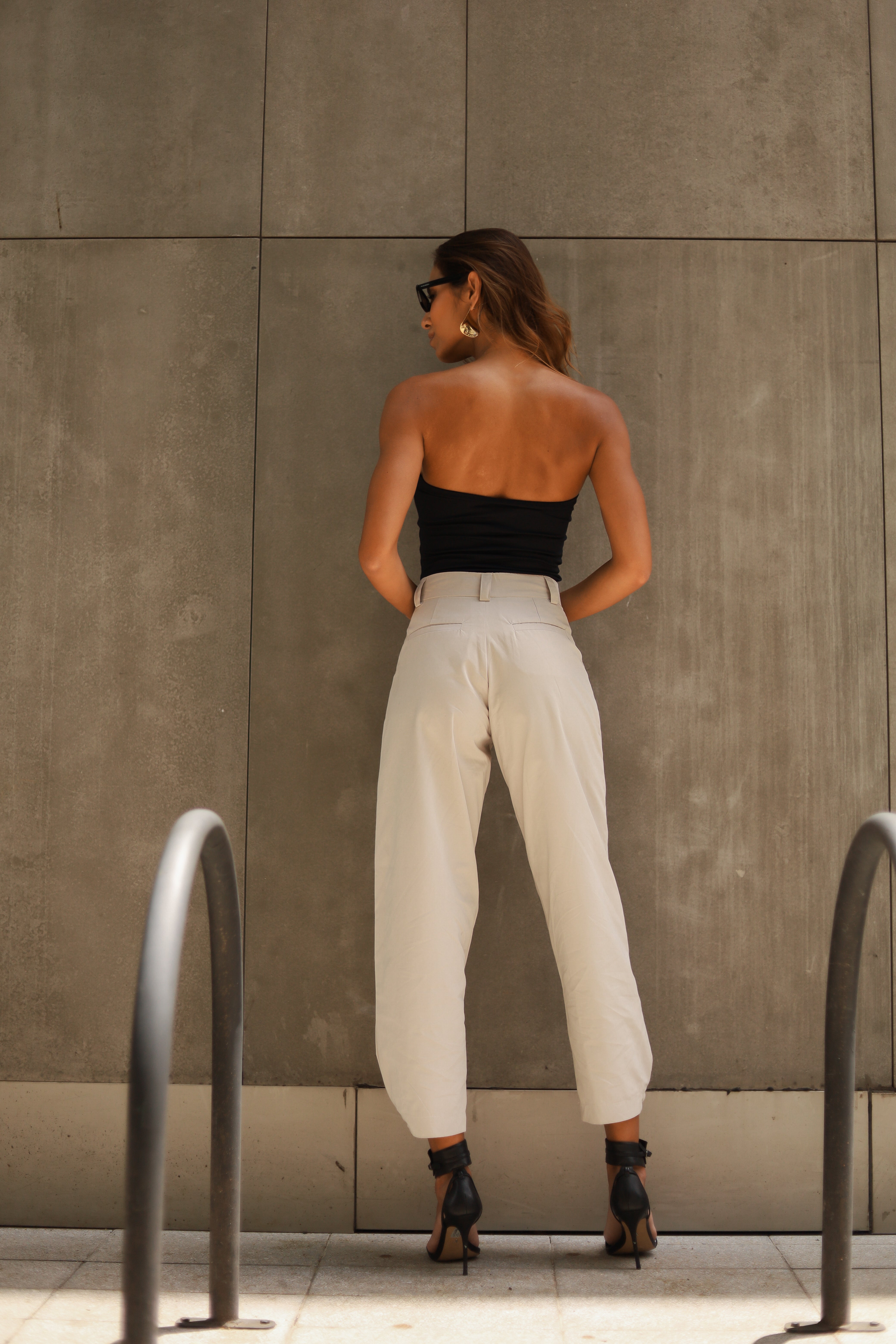 - Calça em tecido tecnológico, cintura alta e modelagem baggy. Possui botão forrado como detalhe na barra.