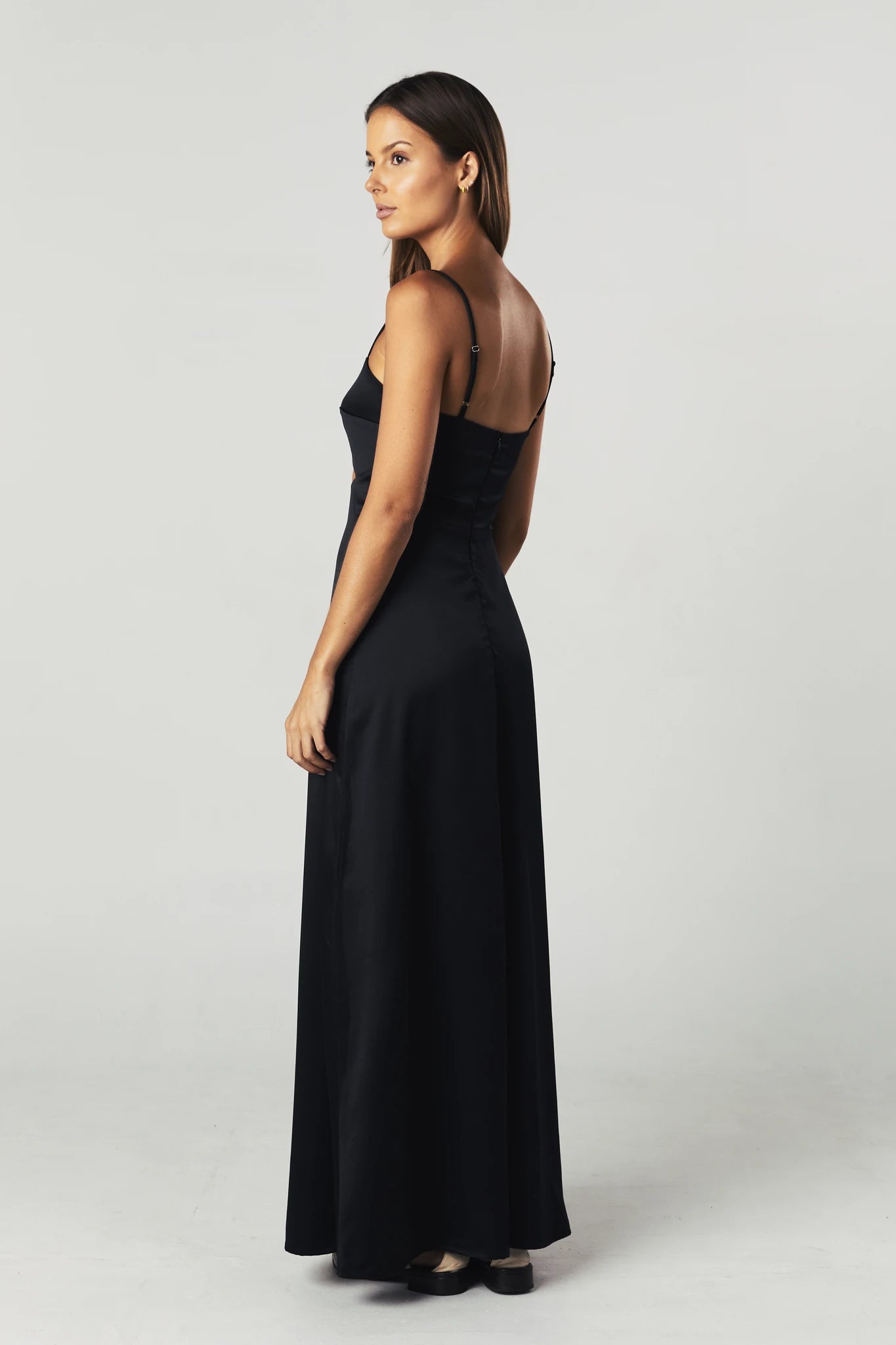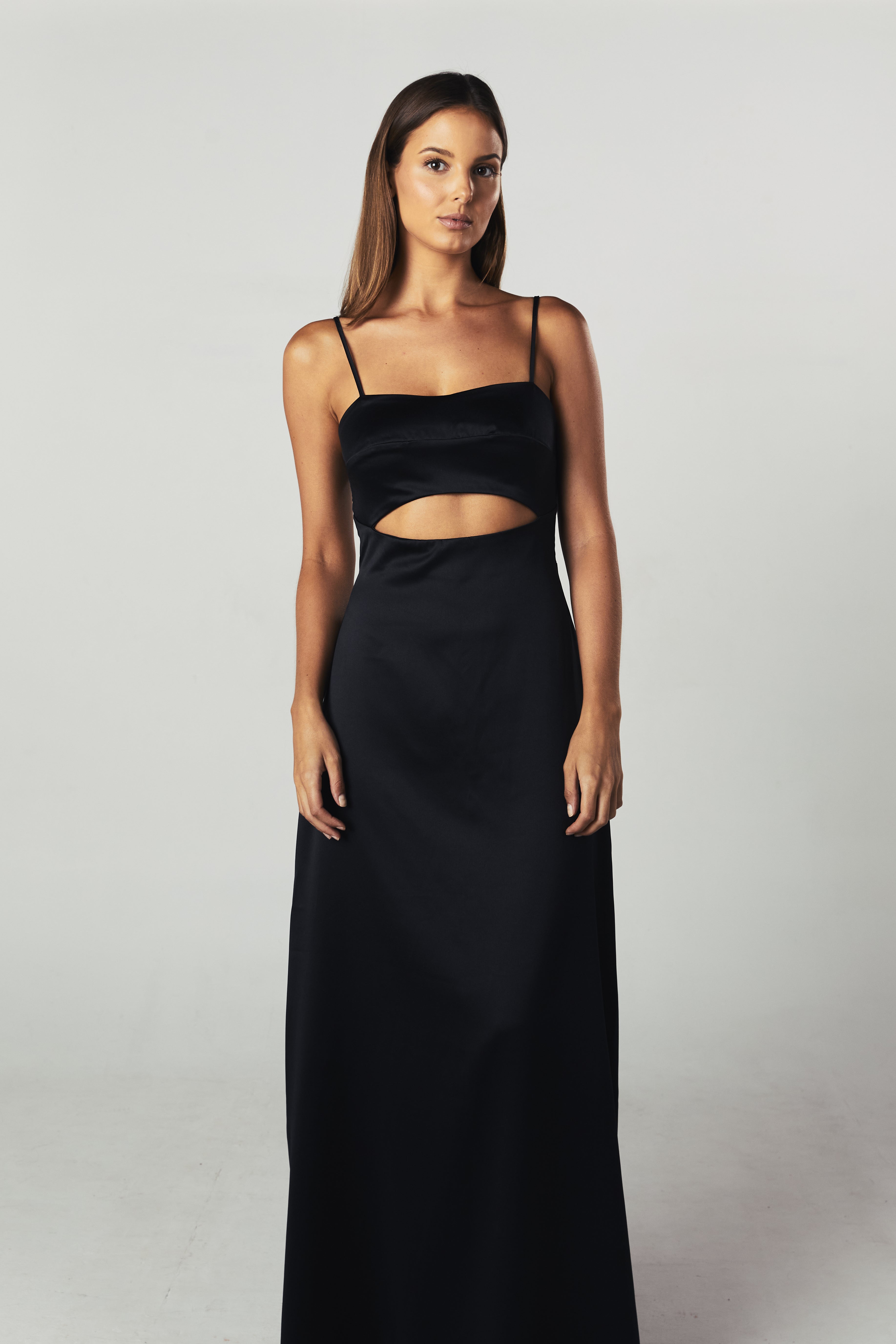 • Vestido em cetim com recorte abaixo do busto, comprimento longo com caimento leve e alça regulável