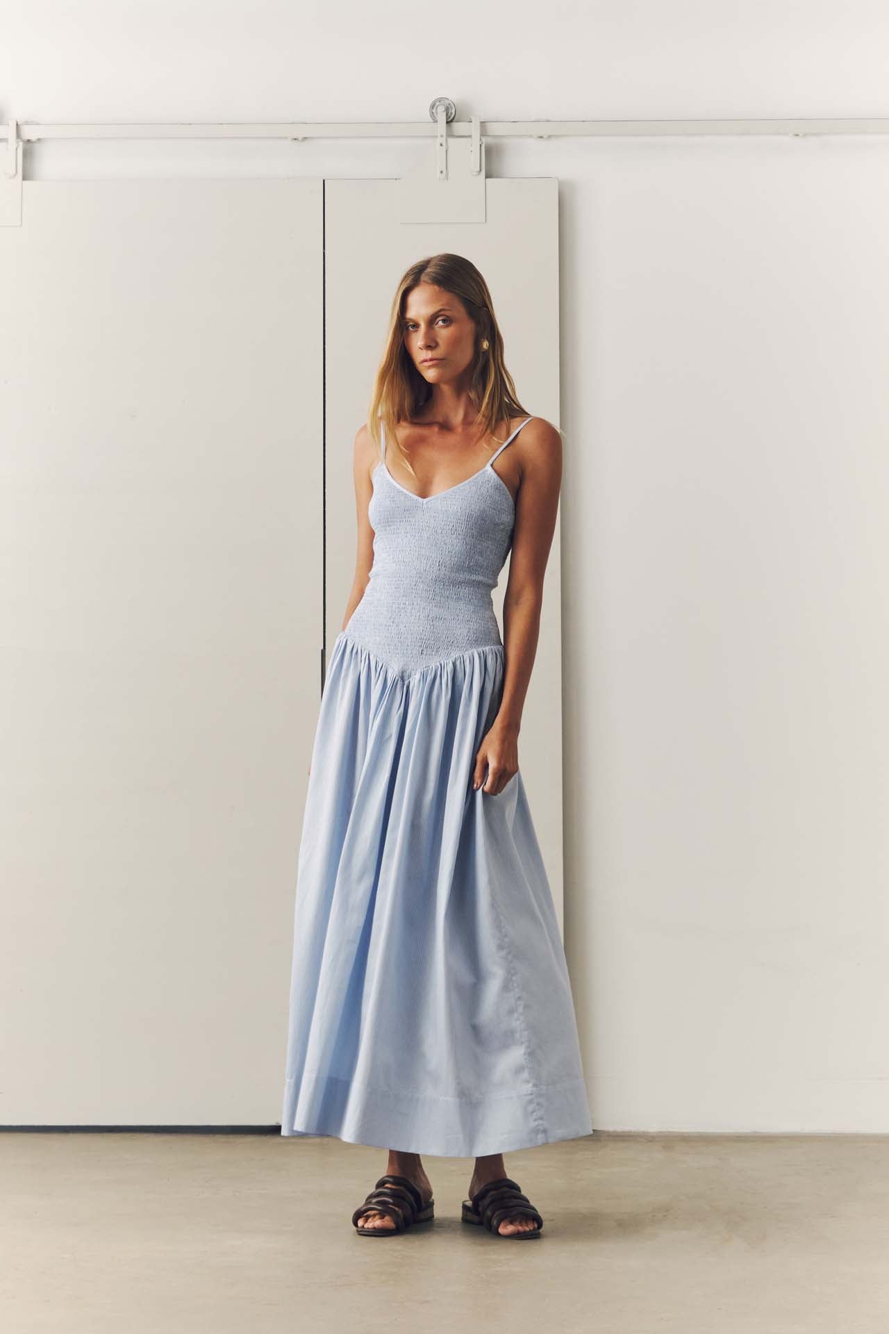 - Vestido azul listrado com parte de cima em lastex e saia ampla.