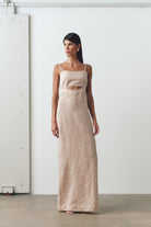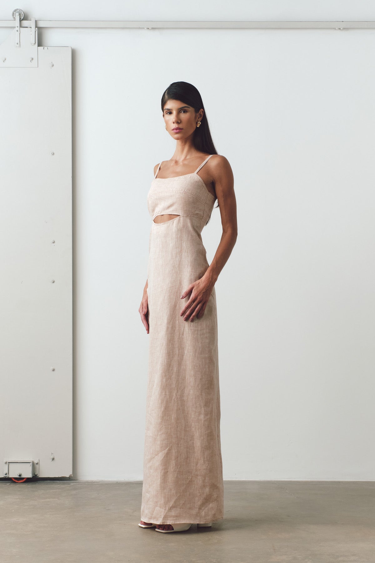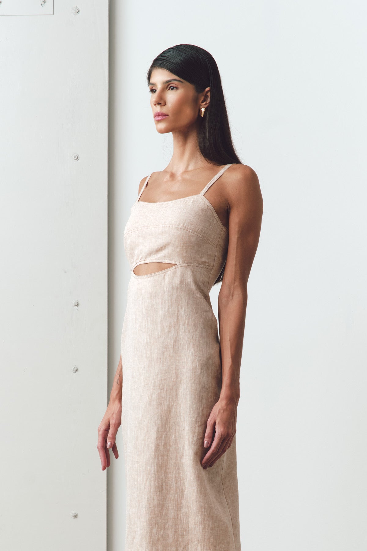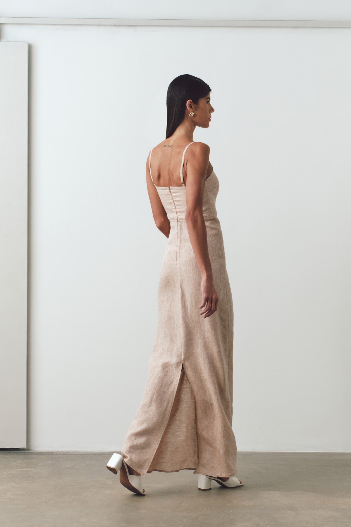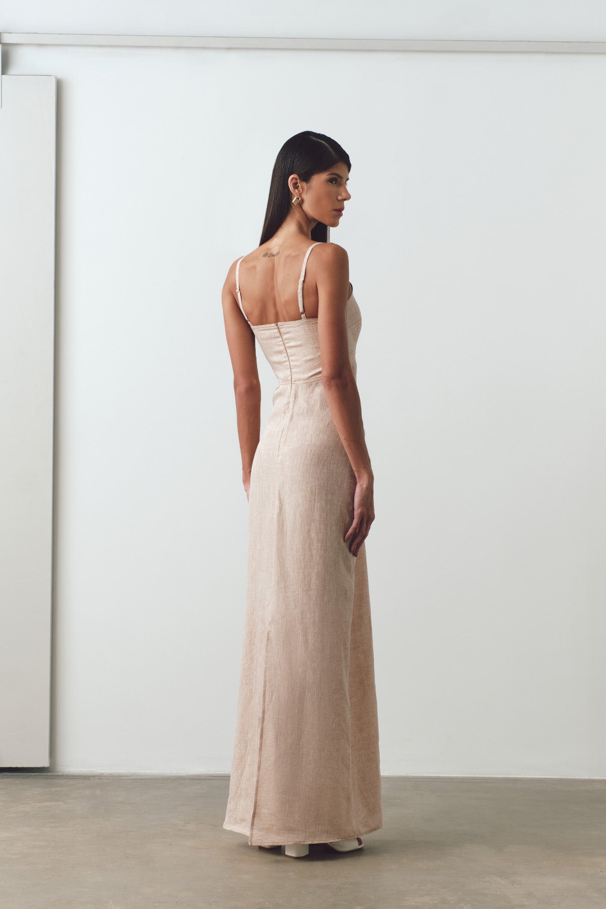 - Vestido Scarlett agora confeccionado em linho premium, com produção nacional, ecológico feito com tingimento natural. Vestido com recorte abaixo do busto, fenda na parte de trás, comprimento longo com caimento leve e alça regulável.
